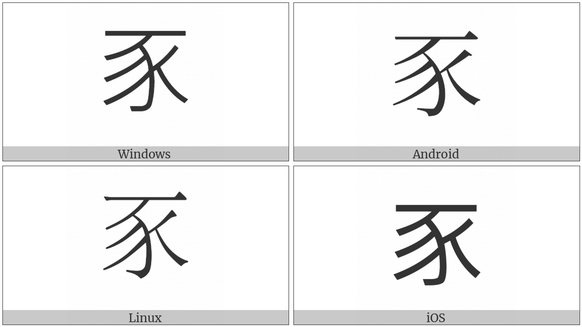 The image below shows how the “Kangxi Radical Pig” symbol might look like on different operating systems. If the font in which this web site is displayed does not contain the symbol and there is no fallback font able to render it, you can use the image below to get an idea of what it should look like.