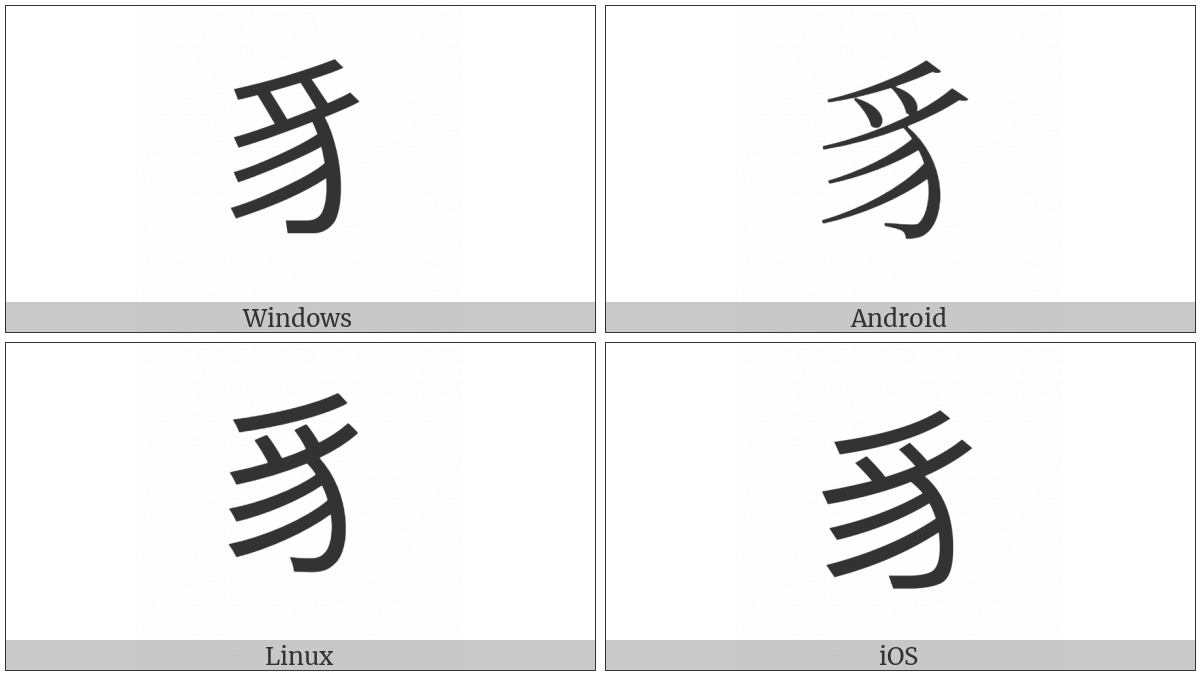 The image below shows how the “Kangxi Radical Badger” symbol might look like on different operating systems. If the font in which this web site is displayed does not contain the symbol and there is no fallback font able to render it, you can use the image below to get an idea of what it should look like.