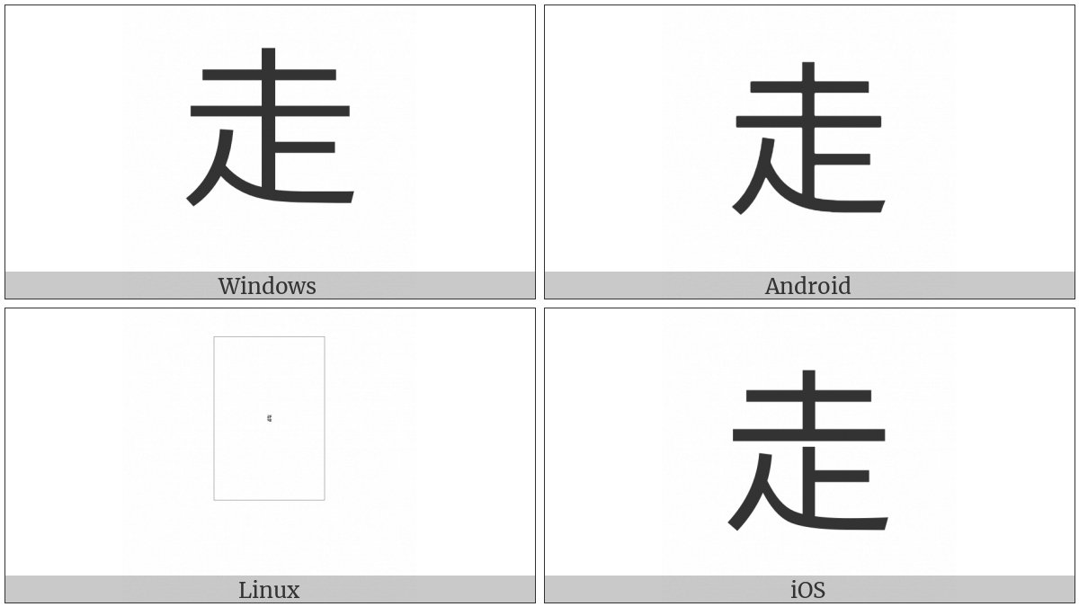 The image below shows how the “Kangxi Radical Run” symbol might look like on different operating systems. If the font in which this web site is displayed does not contain the symbol and there is no fallback font able to render it, you can use the image below to get an idea of what it should look like.