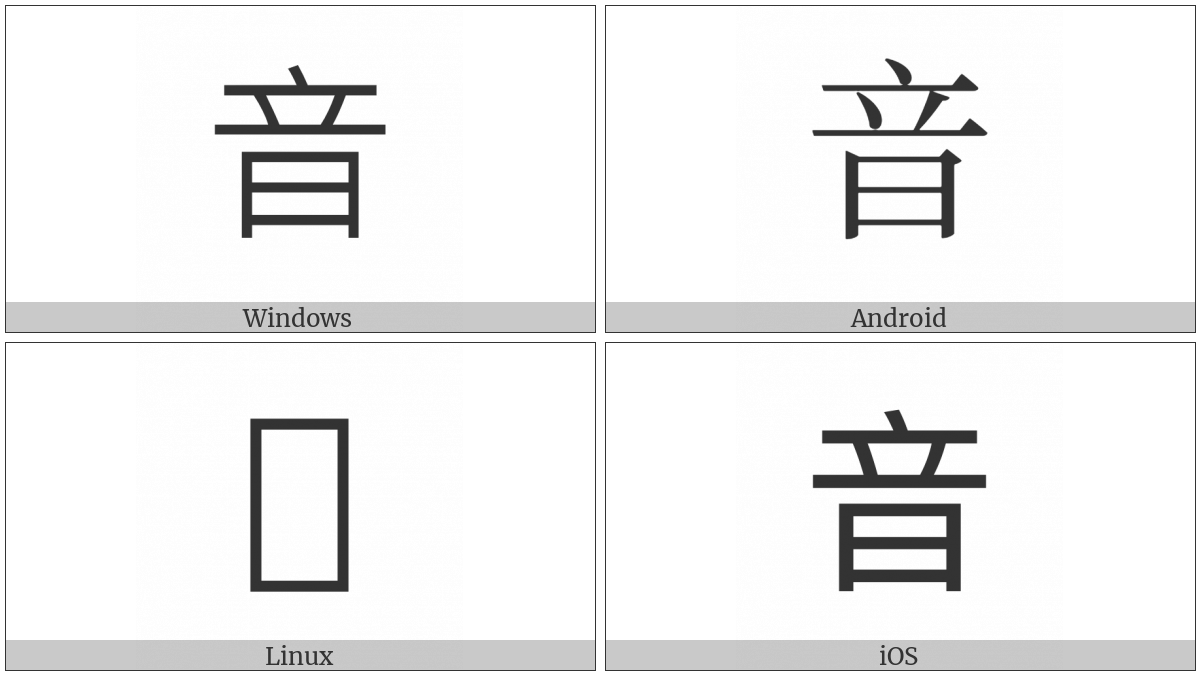 The image below shows how the “Kangxi Radical Sound” symbol might look like on different operating systems. If the font in which this web site is displayed does not contain the symbol and there is no fallback font able to render it, you can use the image below to get an idea of what it should look like.