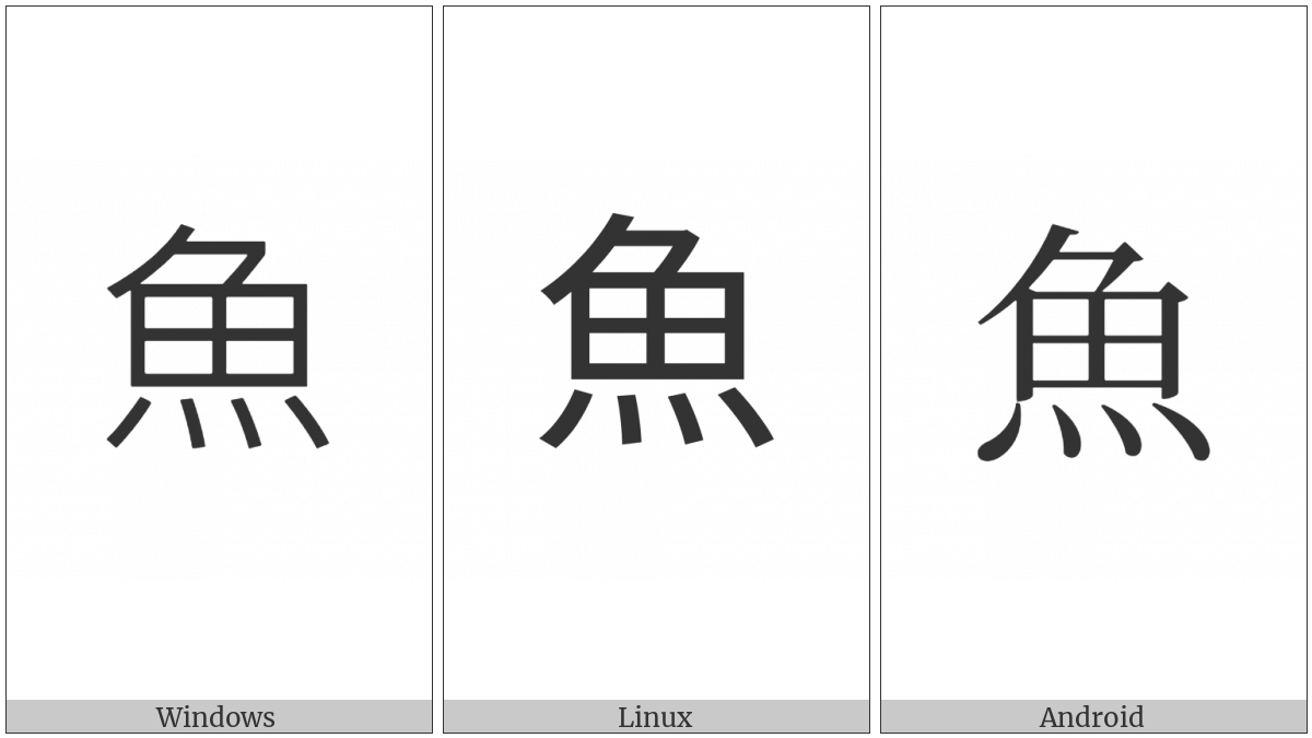 The image below shows how the “Kangxi Radical Fish” symbol might look like on different operating systems. If the font in which this web site is displayed does not contain the symbol and there is no fallback font able to render it, you can use the image below to get an idea of what it should look like.