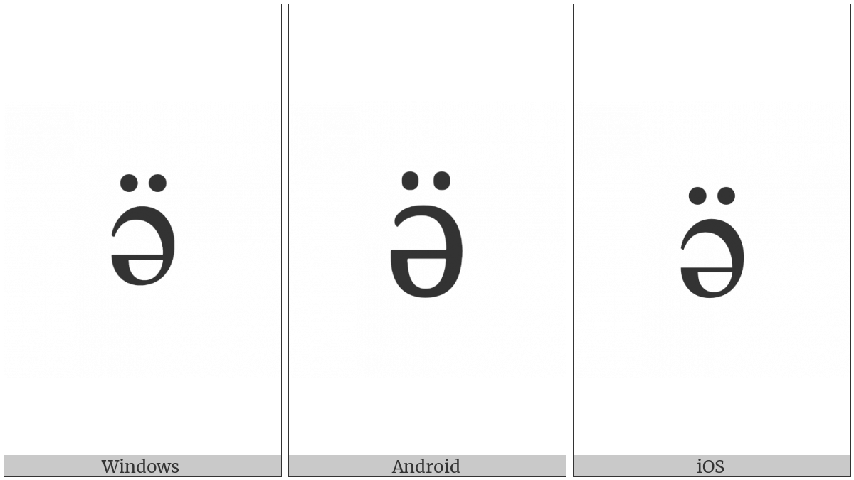 The image below shows how the “Cyrillic Small Letter Schwa With Diaeresis” symbol might look like on different operating systems. If the font in which this web site is displayed does not contain the symbol and there is no fallback font able to render it, you can use the image below to get an idea of what it should look like.
