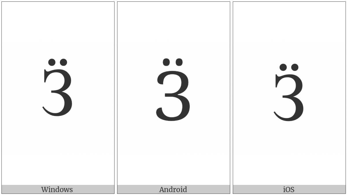The image below shows how the “Cyrillic Capital Letter Ze With Diaeresis” symbol might look like on different operating systems. If the font in which this web site is displayed does not contain the symbol and there is no fallback font able to render it, you can use the image below to get an idea of what it should look like.