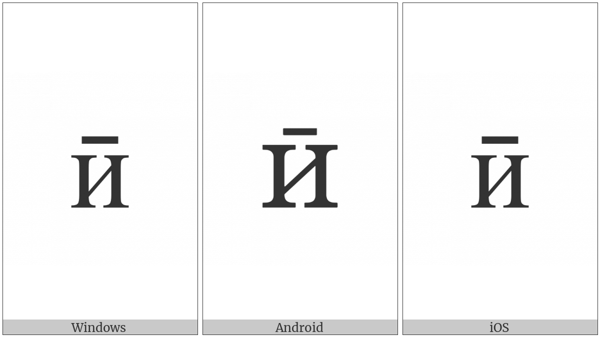 The image below shows how the “Cyrillic Small Letter I With Macron” symbol might look like on different operating systems. If the font in which this web site is displayed does not contain the symbol and there is no fallback font able to render it, you can use the image below to get an idea of what it should look like.