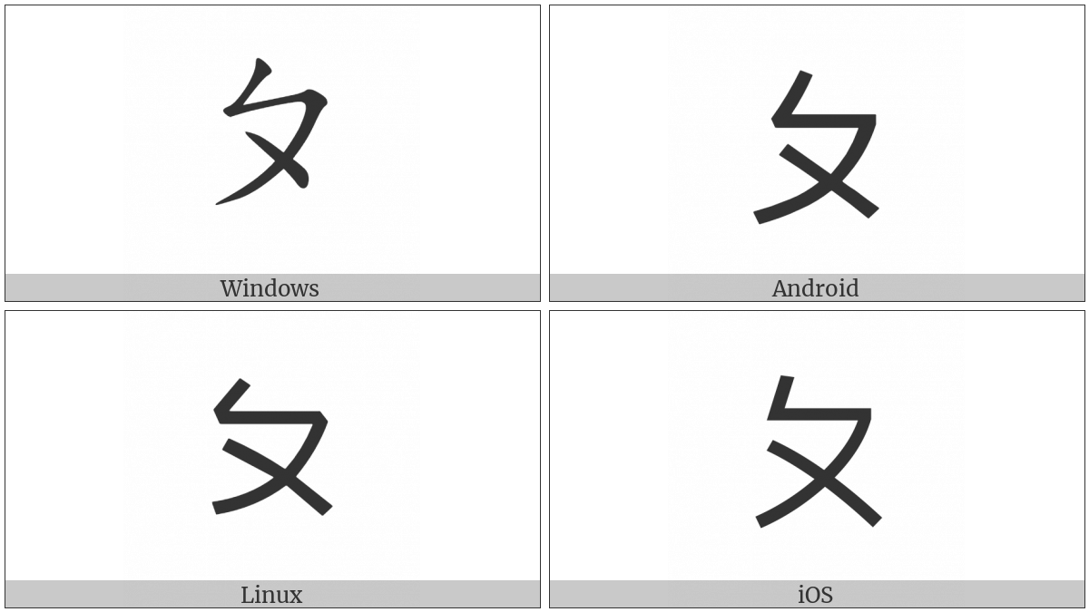 The image below shows how the “Bopomofo Letter P” symbol might look like on different operating systems. If the font in which this web site is displayed does not contain the symbol and there is no fallback font able to render it, you can use the image below to get an idea of what it should look like.