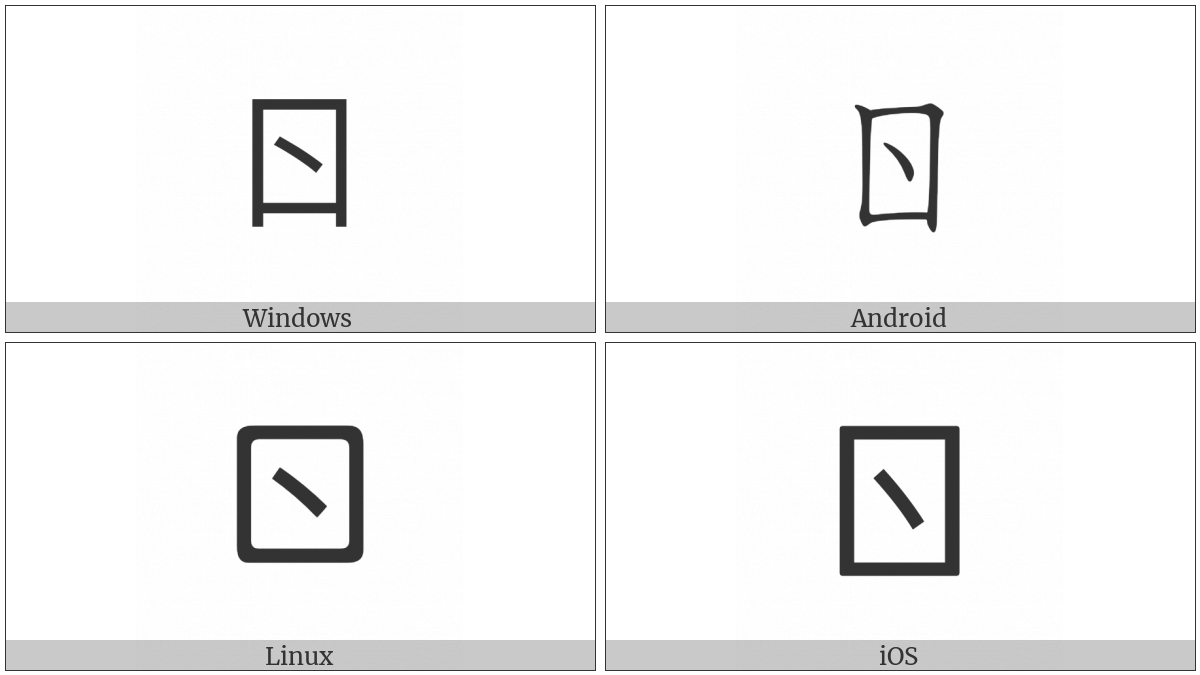 The image below shows how the “Bopomofo Letter R” symbol might look like on different operating systems. If the font in which this web site is displayed does not contain the symbol and there is no fallback font able to render it, you can use the image below to get an idea of what it should look like.