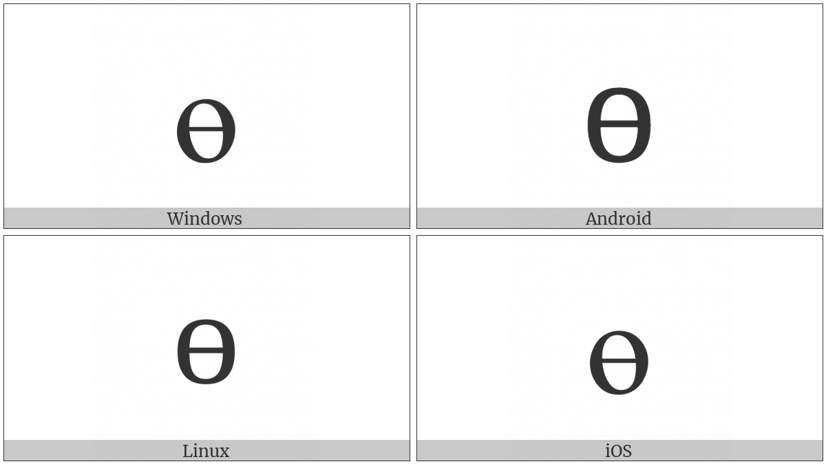 The image below shows how the “Cyrillic Small Letter Barred O” symbol might look like on different operating systems. If the font in which this web site is displayed does not contain the symbol and there is no fallback font able to render it, you can use the image below to get an idea of what it should look like.