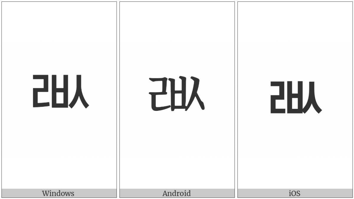 The image below shows how the “Hangul Letter Rieul-Pieup-Sios” symbol might look like on different operating systems. If the font in which this web site is displayed does not contain the symbol and there is no fallback font able to render it, you can use the image below to get an idea of what it should look like.