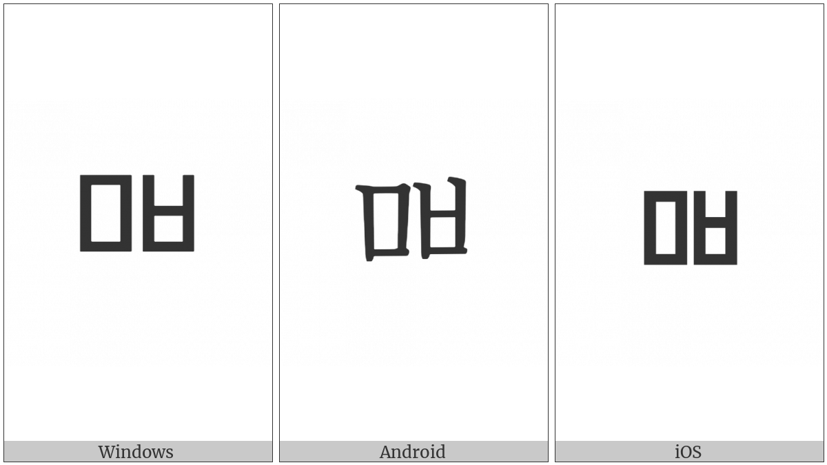 The image below shows how the “Hangul Letter Mieum-Pieup” symbol might look like on different operating systems. If the font in which this web site is displayed does not contain the symbol and there is no fallback font able to render it, you can use the image below to get an idea of what it should look like.