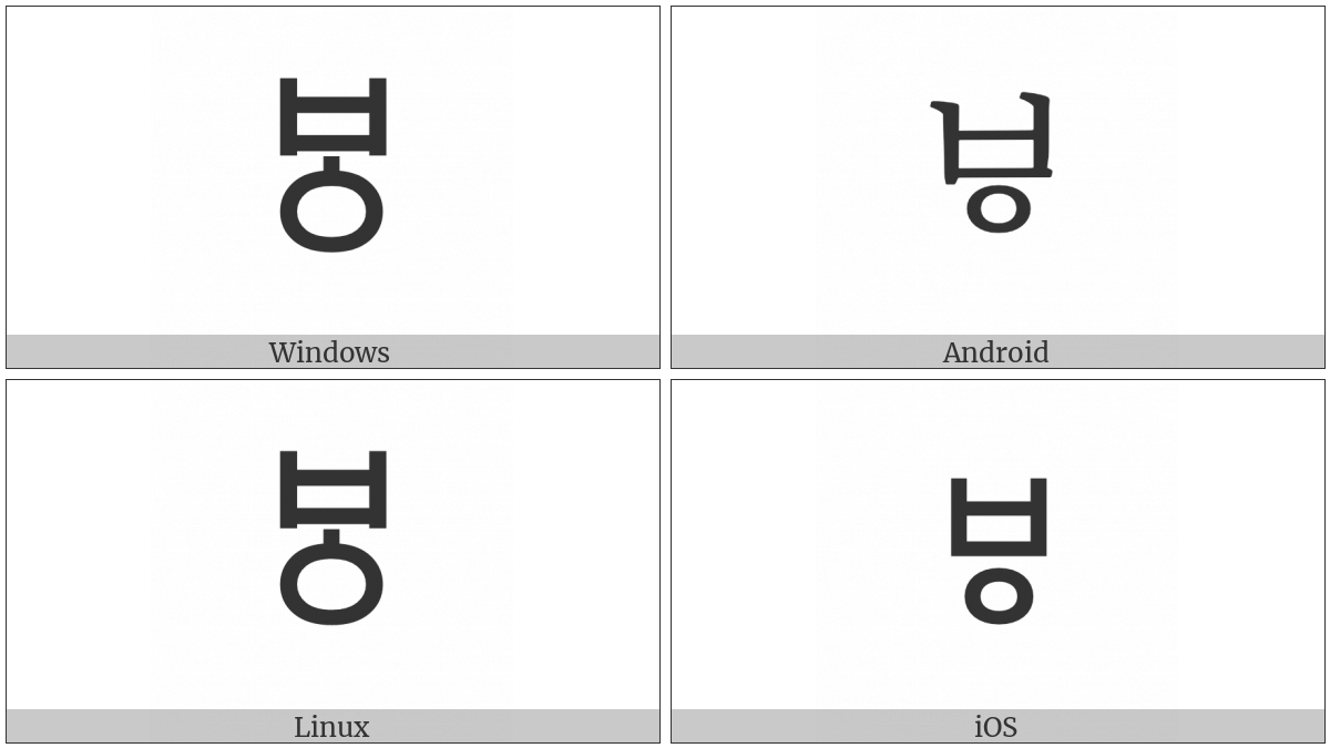 The image below shows how the “Hangul Letter Kapyeounpieup” symbol might look like on different operating systems. If the font in which this web site is displayed does not contain the symbol and there is no fallback font able to render it, you can use the image below to get an idea of what it should look like.