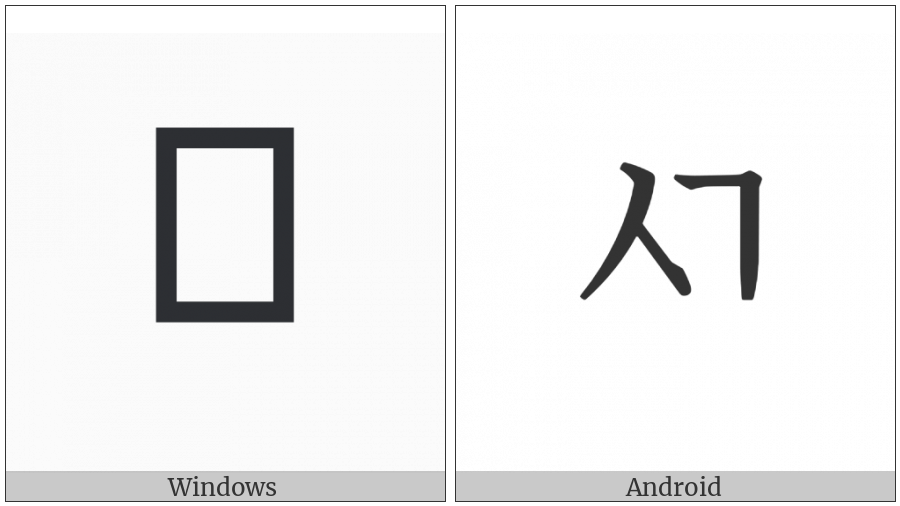 The image below shows how the “Hangul Letter Sios-Kiyeok” symbol might look like on different operating systems. If the font in which this web site is displayed does not contain the symbol and there is no fallback font able to render it, you can use the image below to get an idea of what it should look like.