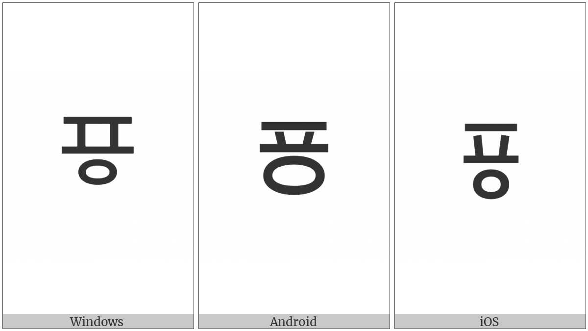 The image below shows how the “Hangul Letter Kapyeounphieuph” symbol might look like on different operating systems. If the font in which this web site is displayed does not contain the symbol and there is no fallback font able to render it, you can use the image below to get an idea of what it should look like.