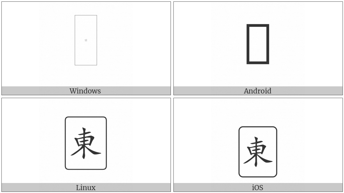 The image below shows how the “Mahjong Tile East Wind” symbol might look like on different operating systems. If the font in which this web site is displayed does not contain the symbol and there is no fallback font able to render it, you can use the image below to get an idea of what it should look like.