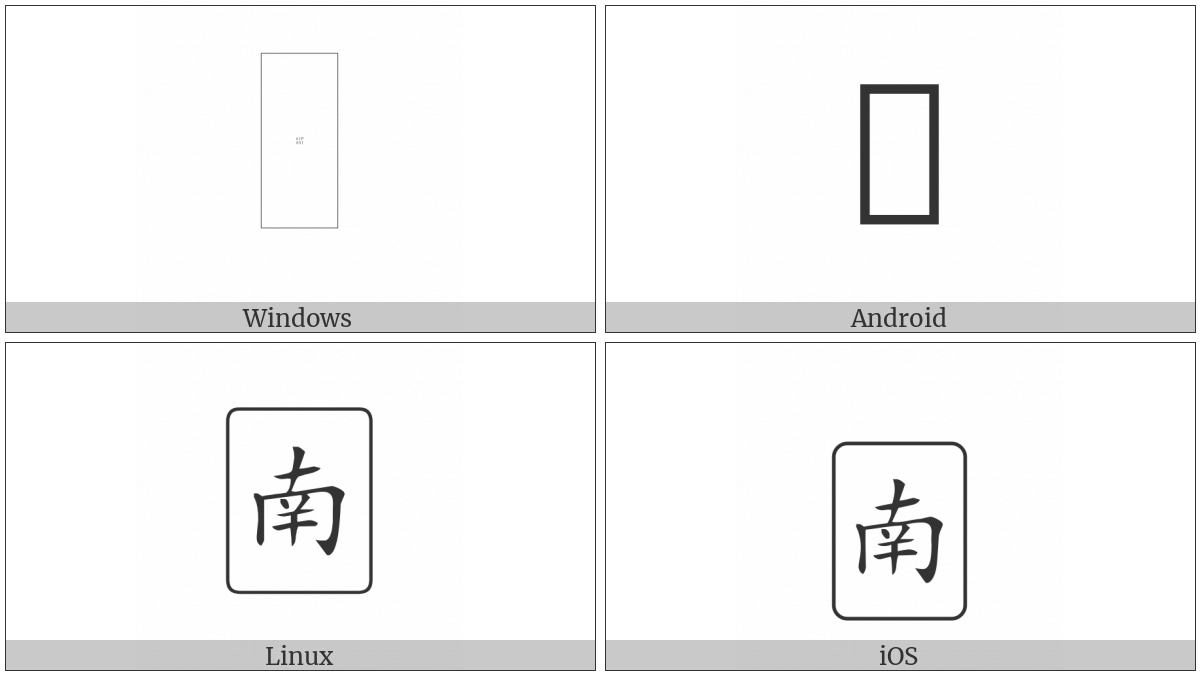 The image below shows how the “Mahjong Tile South Wind” symbol might look like on different operating systems. If the font in which this web site is displayed does not contain the symbol and there is no fallback font able to render it, you can use the image below to get an idea of what it should look like.