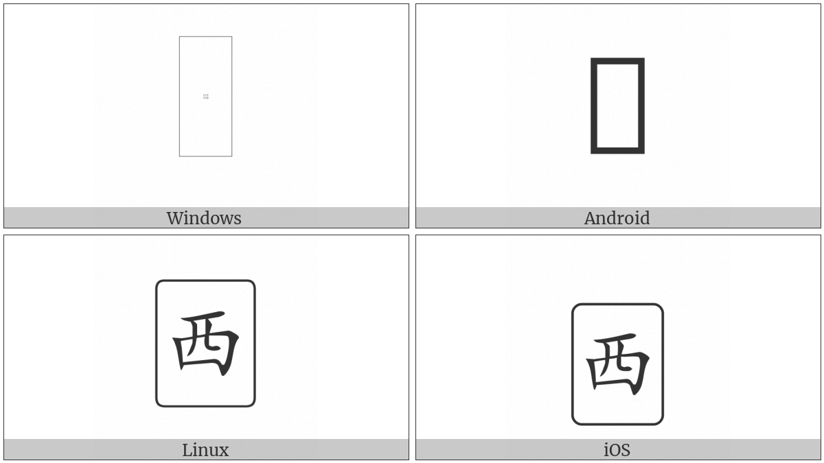 The image below shows how the “Mahjong Tile West Wind” symbol might look like on different operating systems. If the font in which this web site is displayed does not contain the symbol and there is no fallback font able to render it, you can use the image below to get an idea of what it should look like.