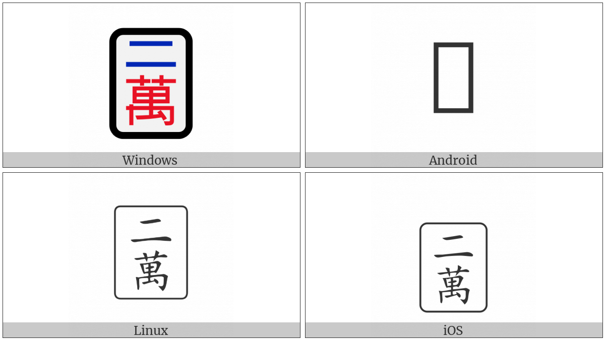 The image below shows how the “Mahjong Tile Two Of Characters” symbol might look like on different operating systems. If the font in which this web site is displayed does not contain the symbol and there is no fallback font able to render it, you can use the image below to get an idea of what it should look like.