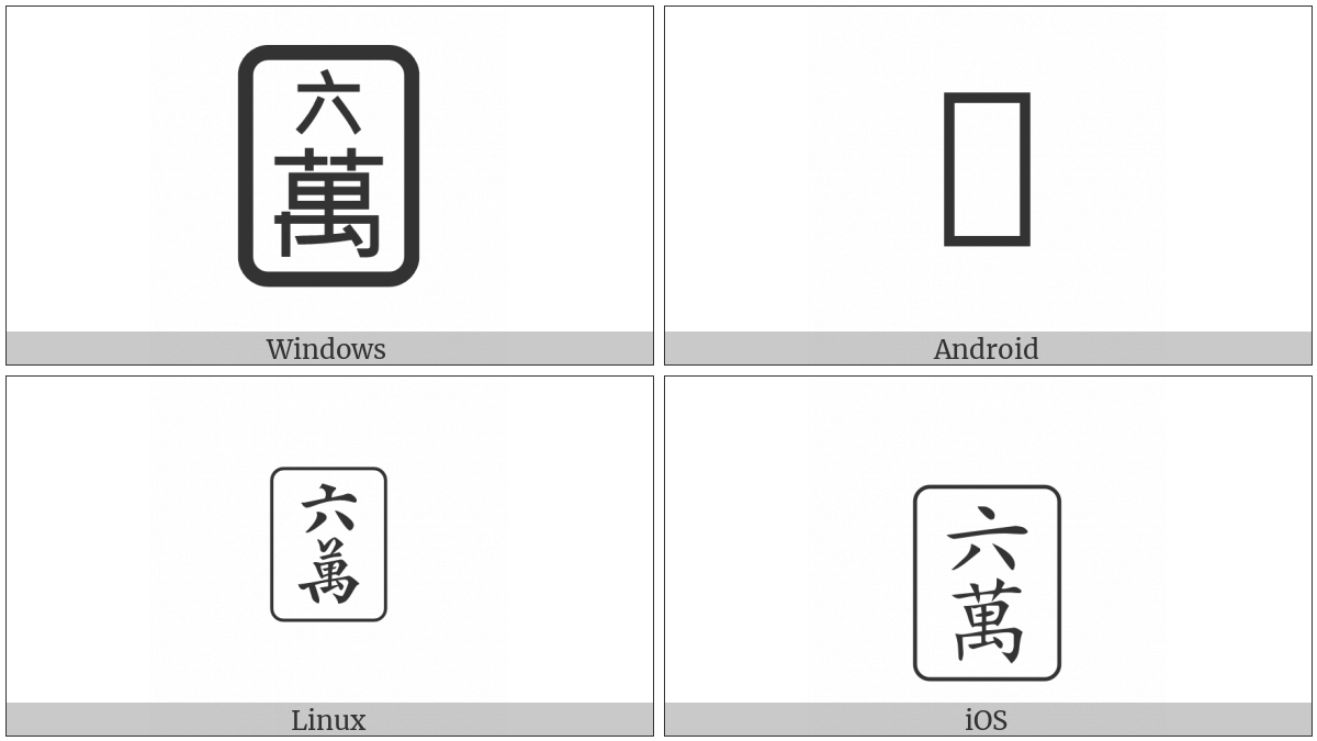 The image below shows how the “Mahjong Tile Six Of Characters” symbol might look like on different operating systems. If the font in which this web site is displayed does not contain the symbol and there is no fallback font able to render it, you can use the image below to get an idea of what it should look like.