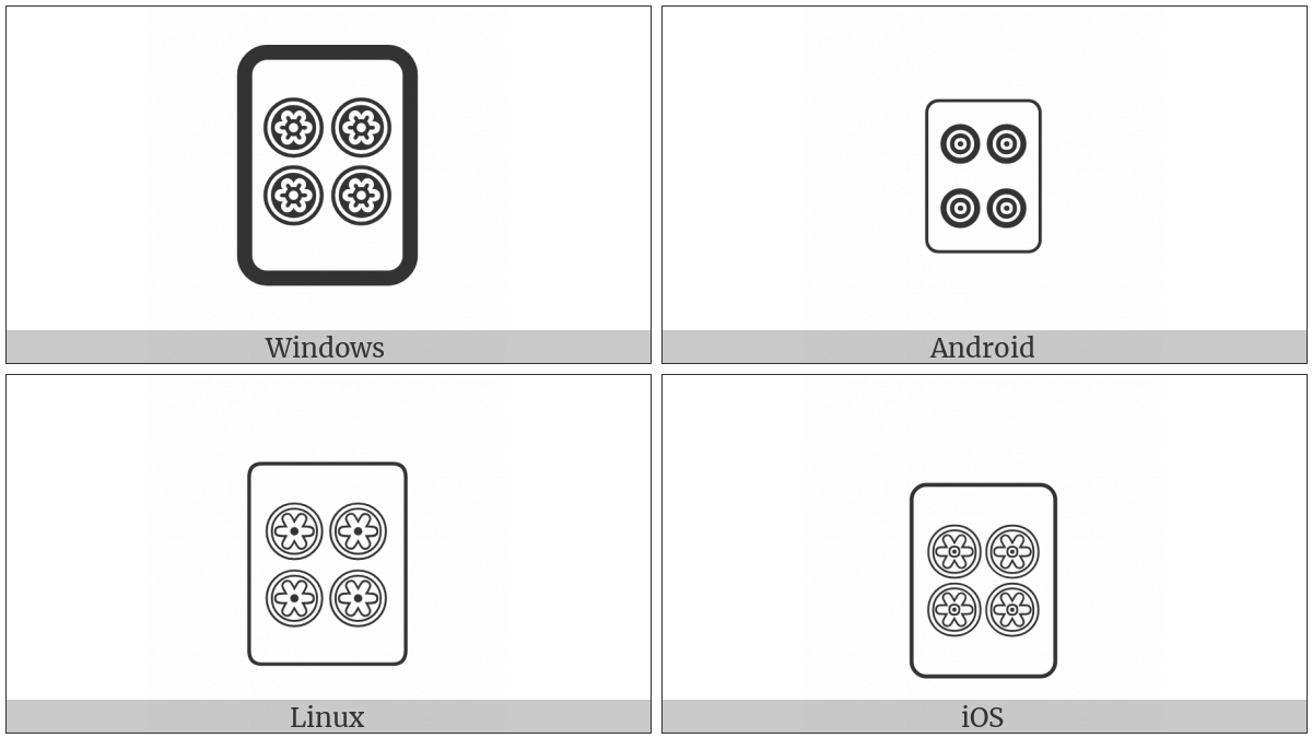 The image below shows how the “Mahjong Tile Four Of Circles” symbol might look like on different operating systems. If the font in which this web site is displayed does not contain the symbol and there is no fallback font able to render it, you can use the image below to get an idea of what it should look like.