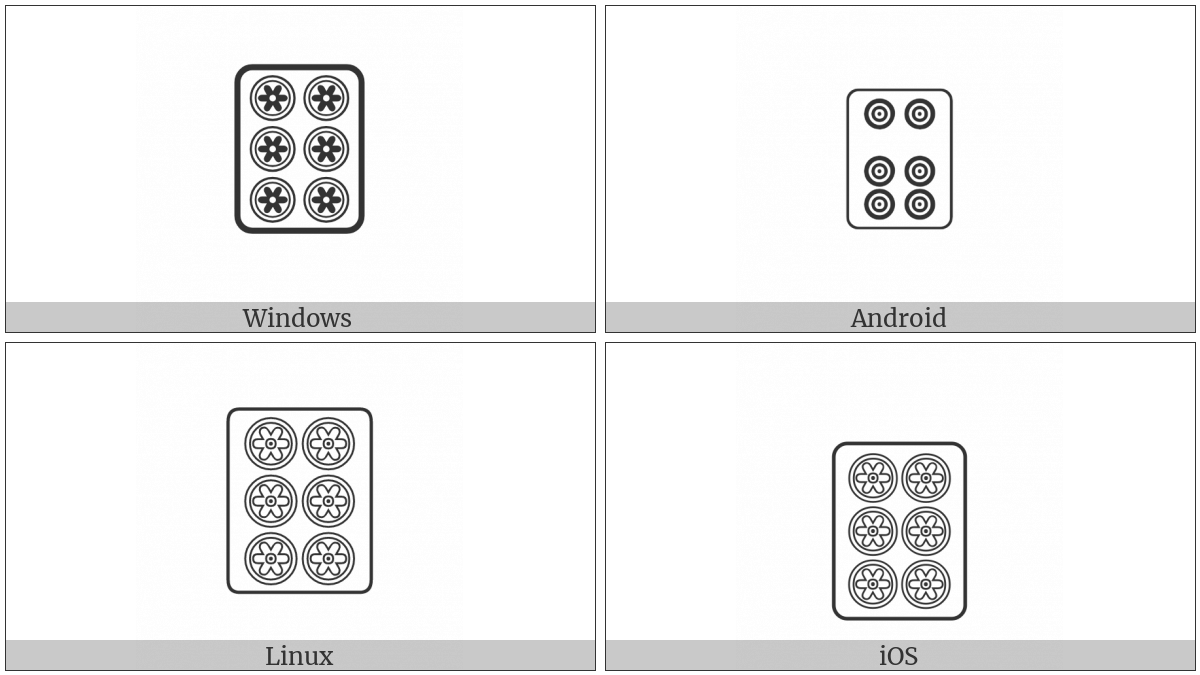The image below shows how the “Mahjong Tile Six Of Circles” symbol might look like on different operating systems. If the font in which this web site is displayed does not contain the symbol and there is no fallback font able to render it, you can use the image below to get an idea of what it should look like.