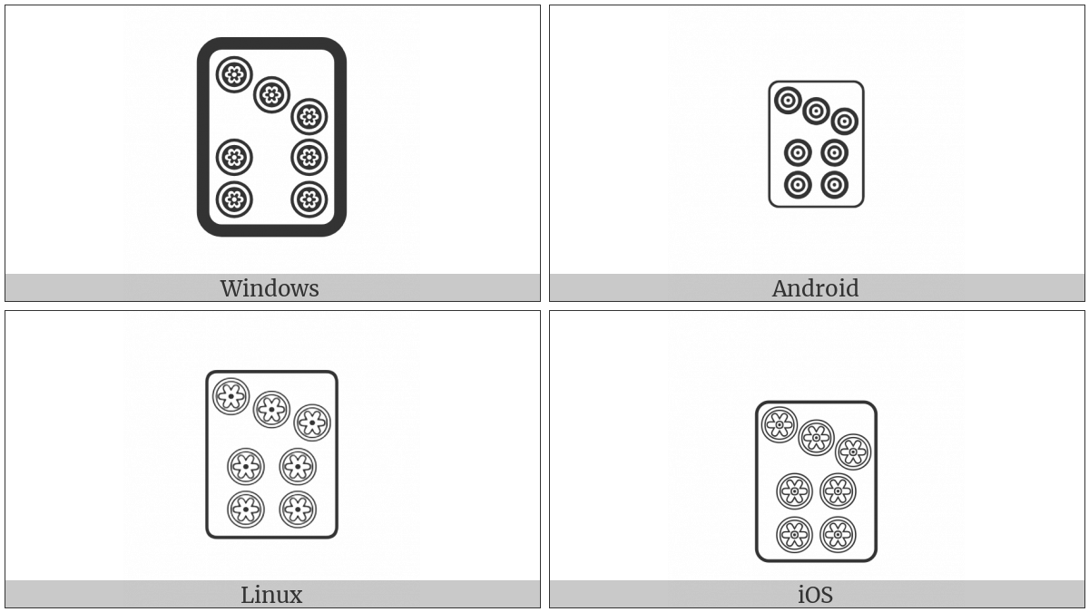The image below shows how the “Mahjong Tile Seven Of Circles” symbol might look like on different operating systems. If the font in which this web site is displayed does not contain the symbol and there is no fallback font able to render it, you can use the image below to get an idea of what it should look like.