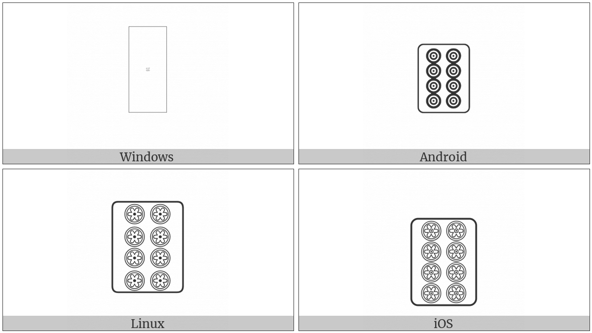 The image below shows how the “Mahjong Tile Eight Of Circles” symbol might look like on different operating systems. If the font in which this web site is displayed does not contain the symbol and there is no fallback font able to render it, you can use the image below to get an idea of what it should look like.