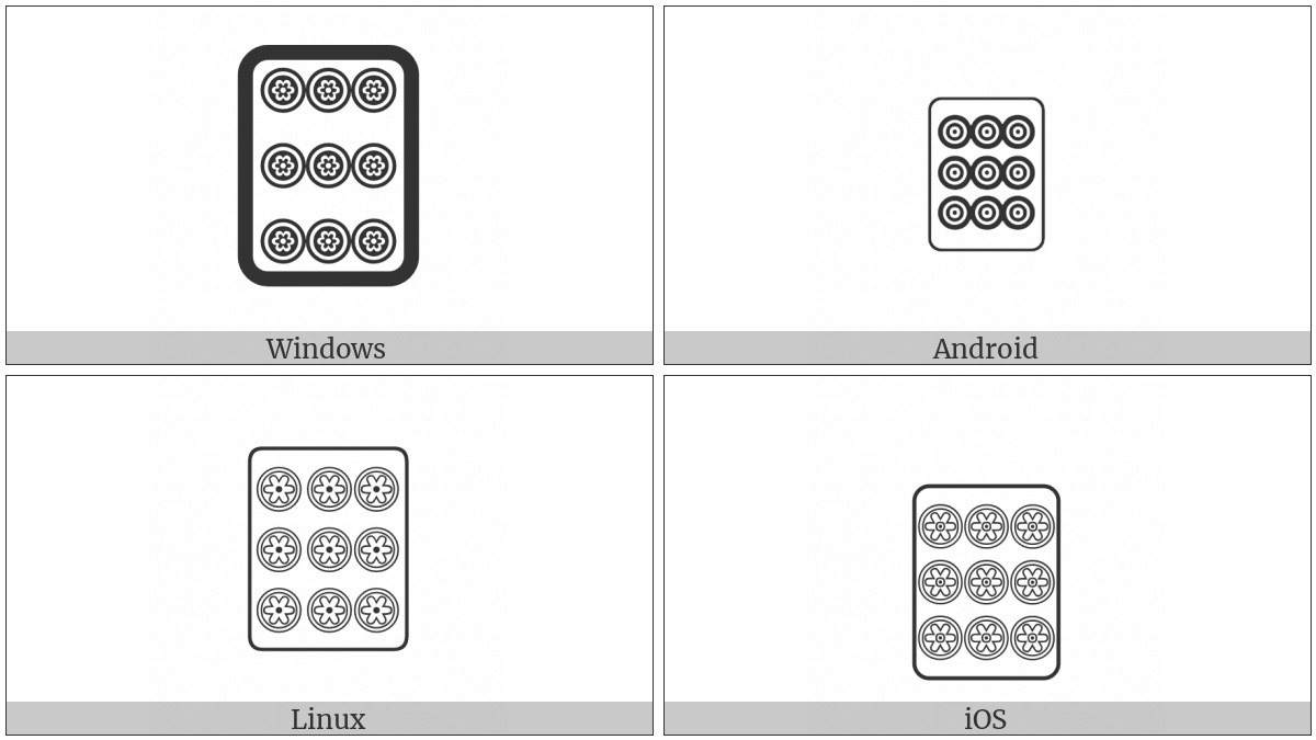 The image below shows how the “Mahjong Tile Nine Of Circles” symbol might look like on different operating systems. If the font in which this web site is displayed does not contain the symbol and there is no fallback font able to render it, you can use the image below to get an idea of what it should look like.