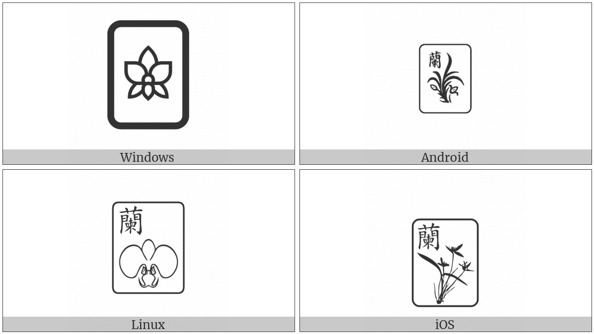 The image below shows how the “Mahjong Tile Orchid” symbol might look like on different operating systems. If the font in which this web site is displayed does not contain the symbol and there is no fallback font able to render it, you can use the image below to get an idea of what it should look like.