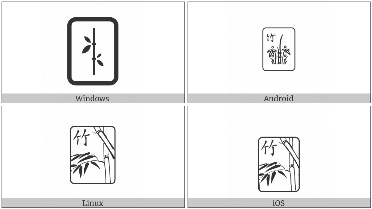 The image below shows how the “Mahjong Tile Bamboo” symbol might look like on different operating systems. If the font in which this web site is displayed does not contain the symbol and there is no fallback font able to render it, you can use the image below to get an idea of what it should look like.