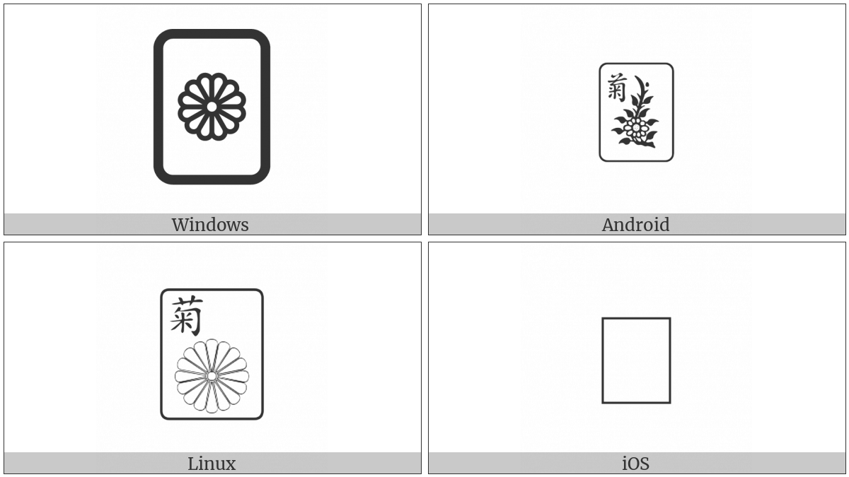 The image below shows how the “Mahjong Tile Chrysanthemum” symbol might look like on different operating systems. If the font in which this web site is displayed does not contain the symbol and there is no fallback font able to render it, you can use the image below to get an idea of what it should look like.