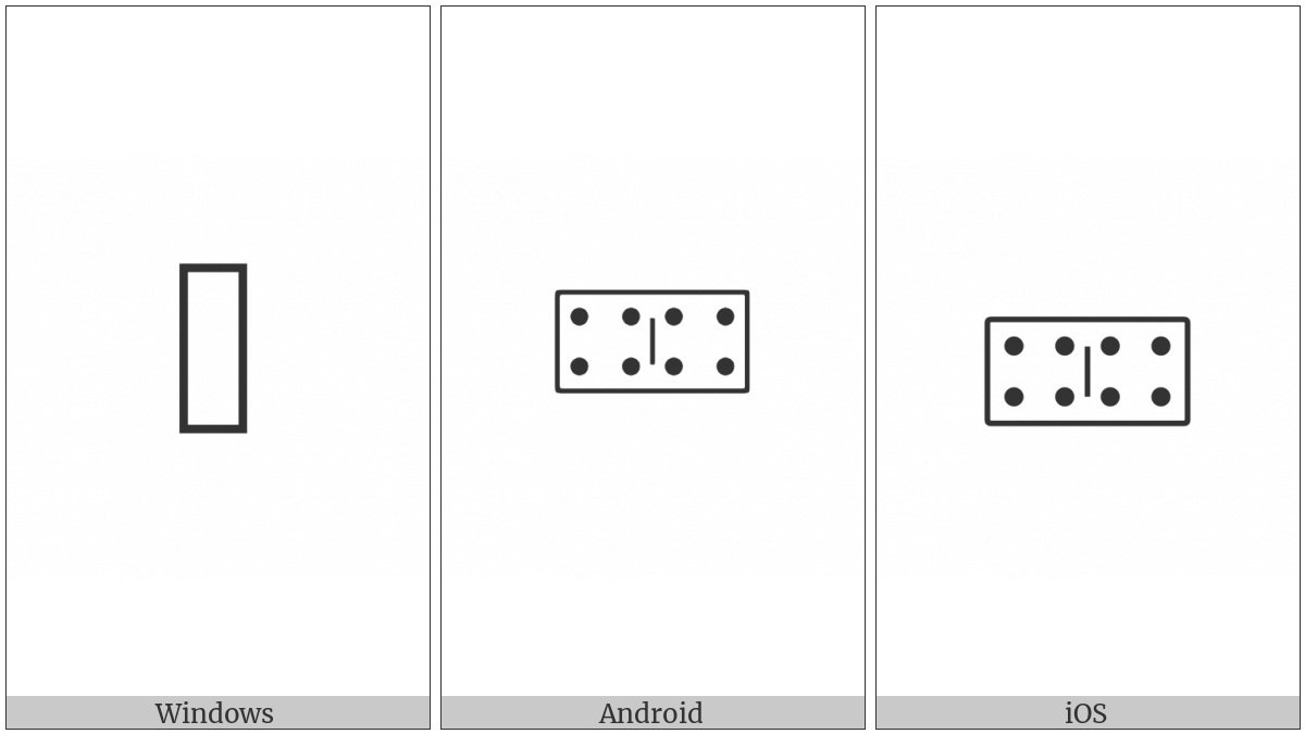 The image below shows how the “Domino Tile Horizontal-04-04” symbol might look like on different operating systems. If the font in which this web site is displayed does not contain the symbol and there is no fallback font able to render it, you can use the image below to get an idea of what it should look like.