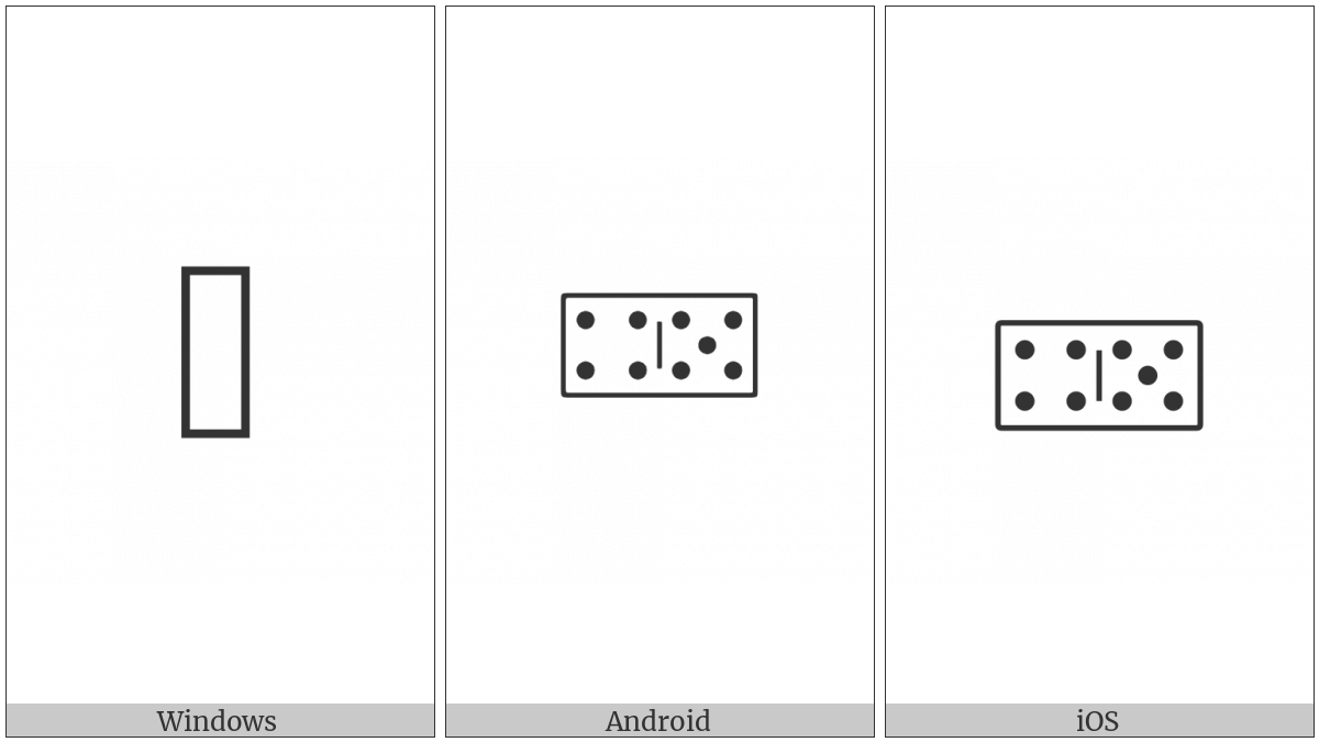 The image below shows how the “Domino Tile Horizontal-04-05” symbol might look like on different operating systems. If the font in which this web site is displayed does not contain the symbol and there is no fallback font able to render it, you can use the image below to get an idea of what it should look like.