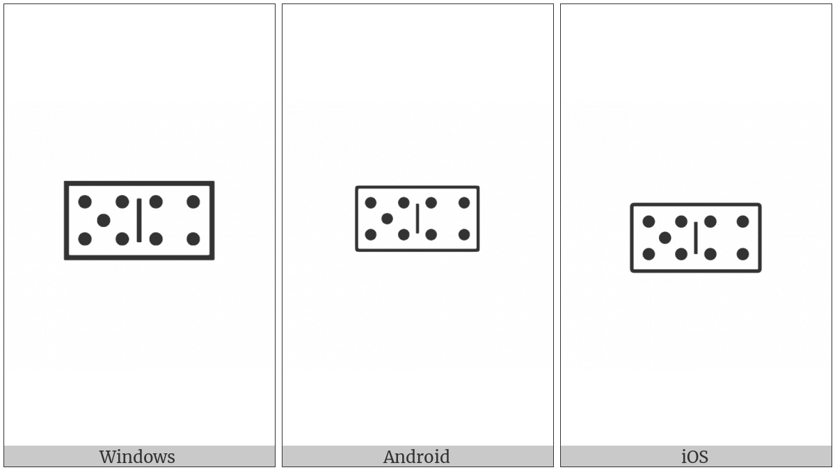 The image below shows how the “Domino Tile Horizontal-05-04” symbol might look like on different operating systems. If the font in which this web site is displayed does not contain the symbol and there is no fallback font able to render it, you can use the image below to get an idea of what it should look like.