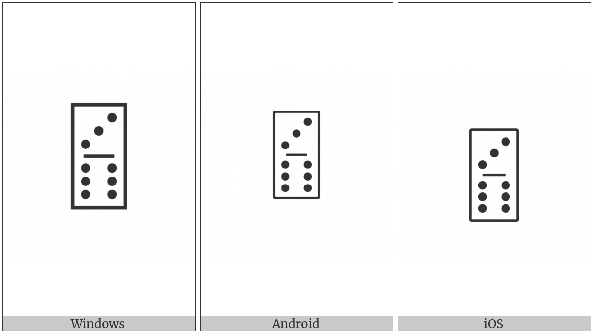 The image below shows how the “Domino Tile Vertical-03-06” symbol might look like on different operating systems. If the font in which this web site is displayed does not contain the symbol and there is no fallback font able to render it, you can use the image below to get an idea of what it should look like.