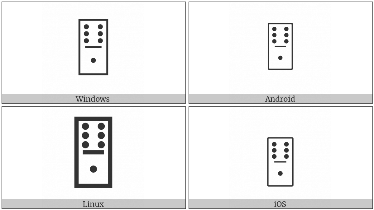 The image below shows how the “Domino Tile Vertical-06-01” symbol might look like on different operating systems. If the font in which this web site is displayed does not contain the symbol and there is no fallback font able to render it, you can use the image below to get an idea of what it should look like.