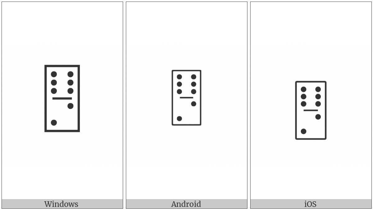 The image below shows how the “Domino Tile Vertical-06-02” symbol might look like on different operating systems. If the font in which this web site is displayed does not contain the symbol and there is no fallback font able to render it, you can use the image below to get an idea of what it should look like.