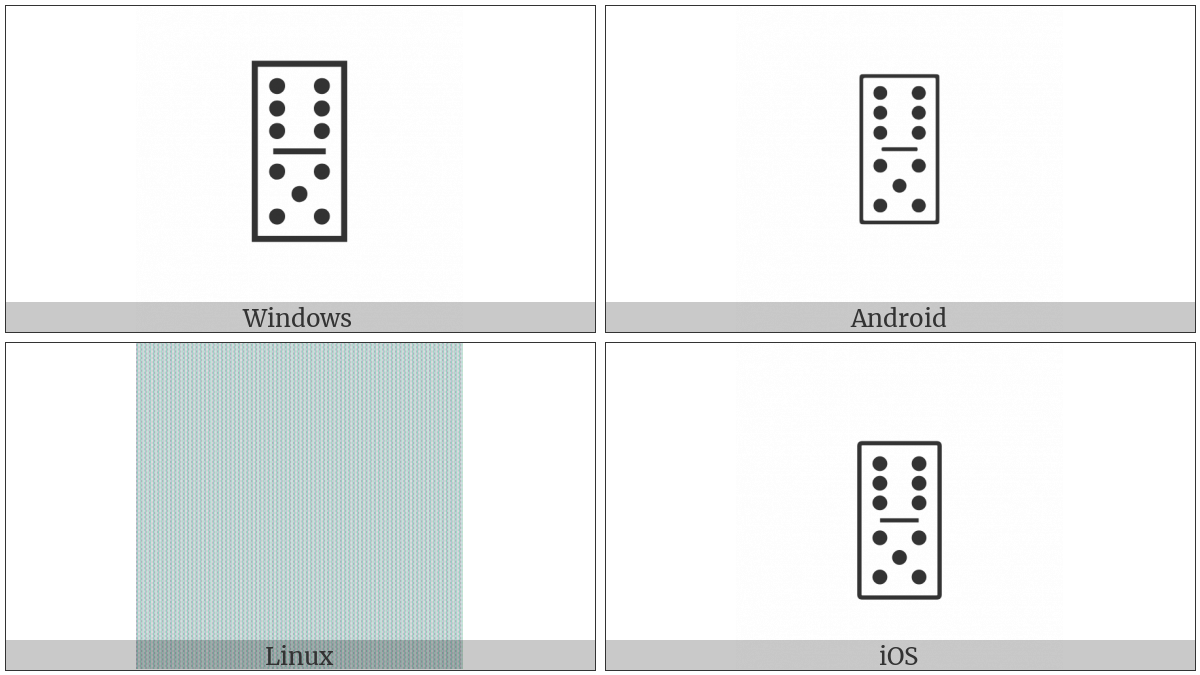 The image below shows how the “Domino Tile Vertical-06-05” symbol might look like on different operating systems. If the font in which this web site is displayed does not contain the symbol and there is no fallback font able to render it, you can use the image below to get an idea of what it should look like.