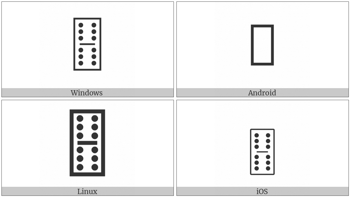 The image below shows how the “Domino Tile Vertical-06-06” symbol might look like on different operating systems. If the font in which this web site is displayed does not contain the symbol and there is no fallback font able to render it, you can use the image below to get an idea of what it should look like.
