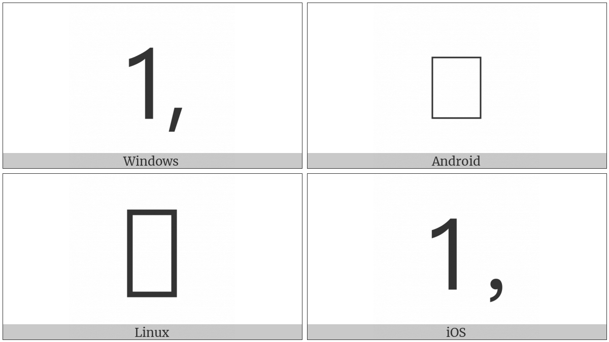 The image below shows how the “Digit One Comma” symbol might look like on different operating systems. If the font in which this web site is displayed does not contain the symbol and there is no fallback font able to render it, you can use the image below to get an idea of what it should look like.