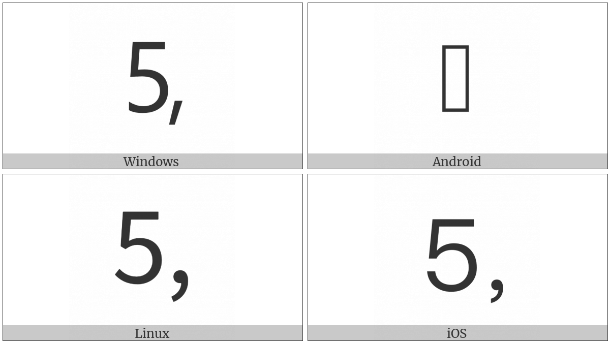 The image below shows how the “Digit Five Comma” symbol might look like on different operating systems. If the font in which this web site is displayed does not contain the symbol and there is no fallback font able to render it, you can use the image below to get an idea of what it should look like.