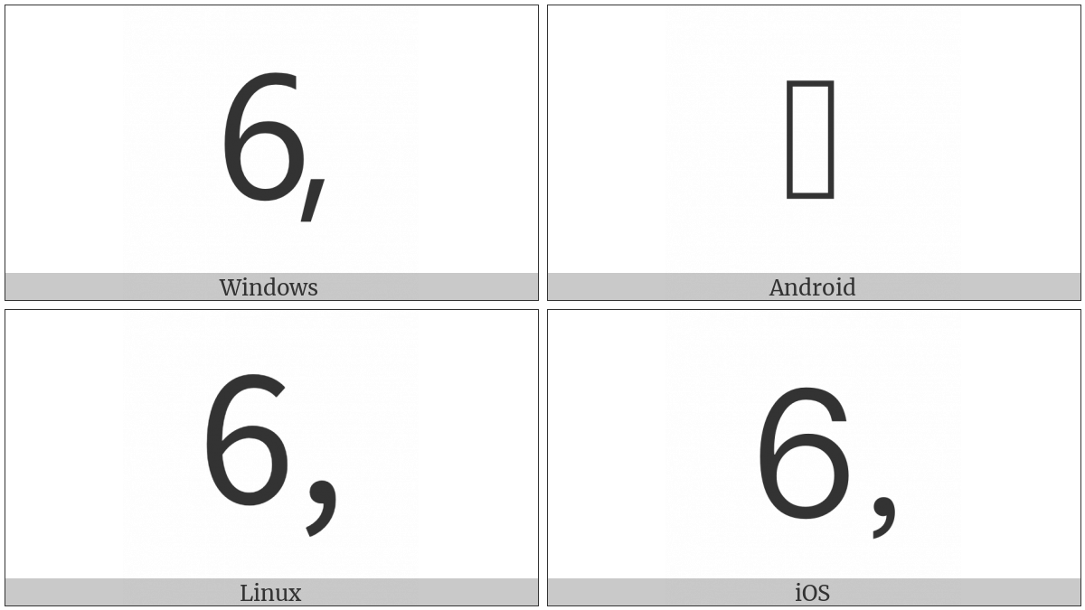 The image below shows how the “Digit Six Comma” symbol might look like on different operating systems. If the font in which this web site is displayed does not contain the symbol and there is no fallback font able to render it, you can use the image below to get an idea of what it should look like.