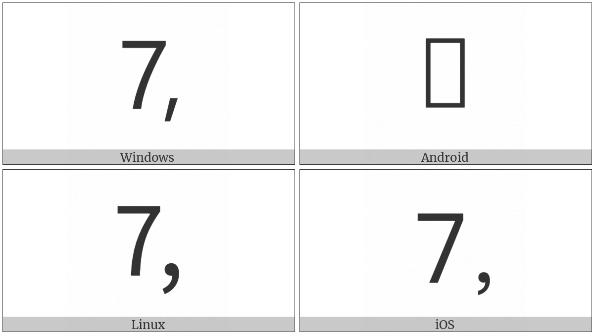 The image below shows how the “Digit Seven Comma” symbol might look like on different operating systems. If the font in which this web site is displayed does not contain the symbol and there is no fallback font able to render it, you can use the image below to get an idea of what it should look like.