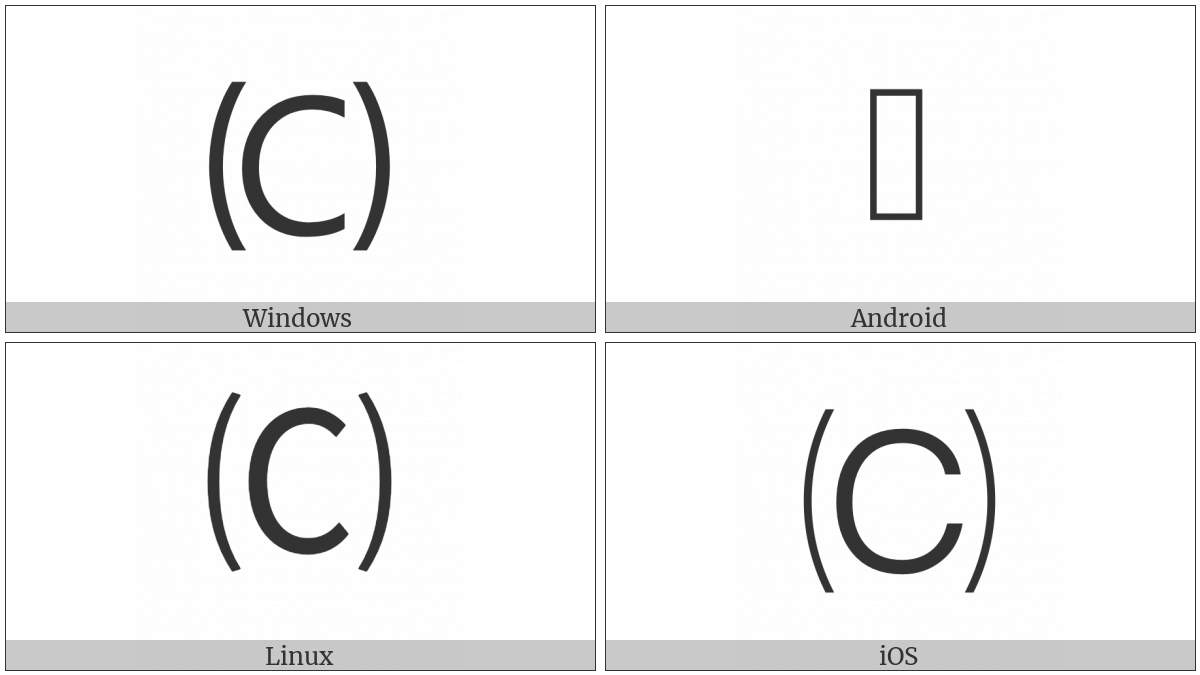 The image below shows how the “Parenthesized Latin Capital Letter C” symbol might look like on different operating systems. If the font in which this web site is displayed does not contain the symbol and there is no fallback font able to render it, you can use the image below to get an idea of what it should look like.