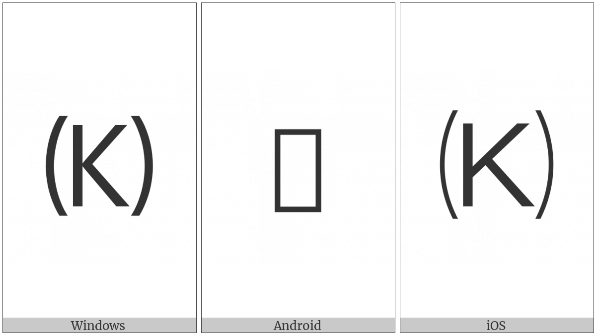 The image below shows how the “Parenthesized Latin Capital Letter K” symbol might look like on different operating systems. If the font in which this web site is displayed does not contain the symbol and there is no fallback font able to render it, you can use the image below to get an idea of what it should look like.