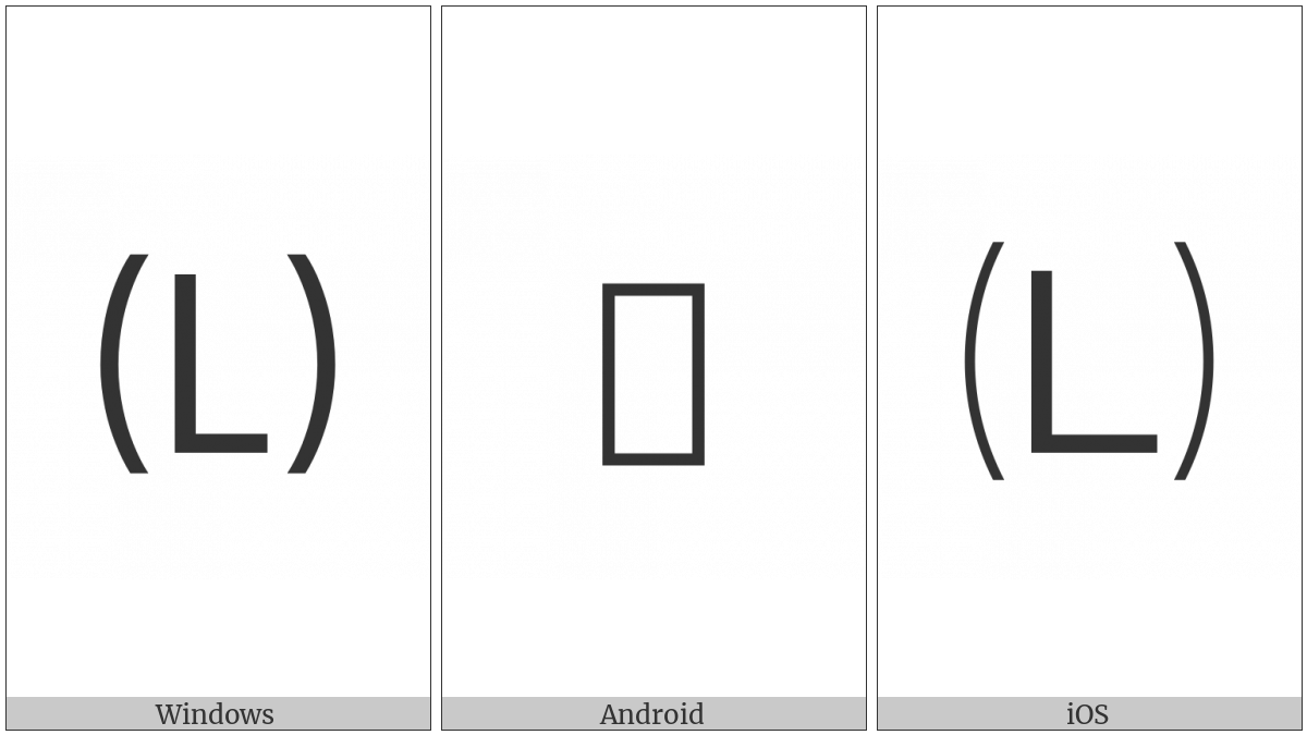The image below shows how the “Parenthesized Latin Capital Letter L” symbol might look like on different operating systems. If the font in which this web site is displayed does not contain the symbol and there is no fallback font able to render it, you can use the image below to get an idea of what it should look like.