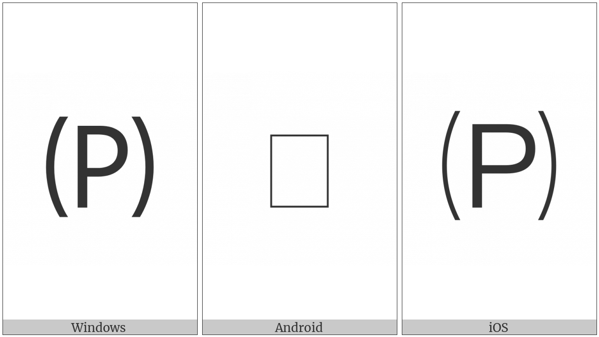 The image below shows how the “Parenthesized Latin Capital Letter P” symbol might look like on different operating systems. If the font in which this web site is displayed does not contain the symbol and there is no fallback font able to render it, you can use the image below to get an idea of what it should look like.
