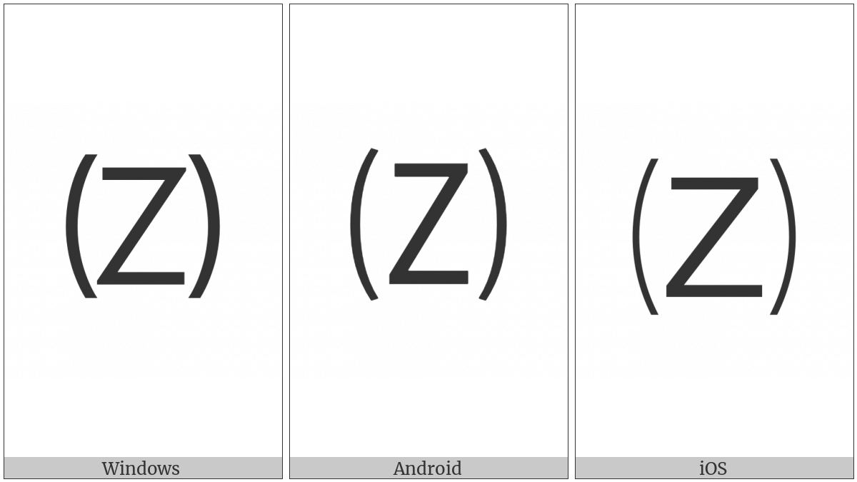 The image below shows how the “Parenthesized Latin Capital Letter Z” symbol might look like on different operating systems. If the font in which this web site is displayed does not contain the symbol and there is no fallback font able to render it, you can use the image below to get an idea of what it should look like.