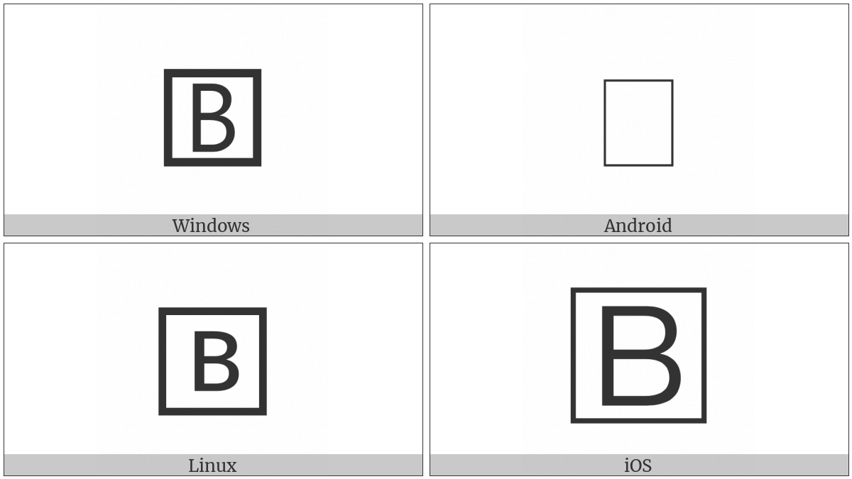 The image below shows how the “Squared Latin Capital Letter B” symbol might look like on different operating systems. If the font in which this web site is displayed does not contain the symbol and there is no fallback font able to render it, you can use the image below to get an idea of what it should look like.