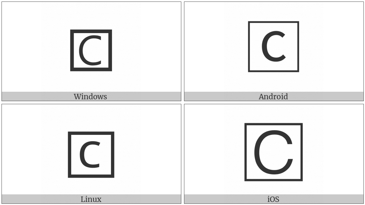 The image below shows how the “Squared Latin Capital Letter C” symbol might look like on different operating systems. If the font in which this web site is displayed does not contain the symbol and there is no fallback font able to render it, you can use the image below to get an idea of what it should look like.
