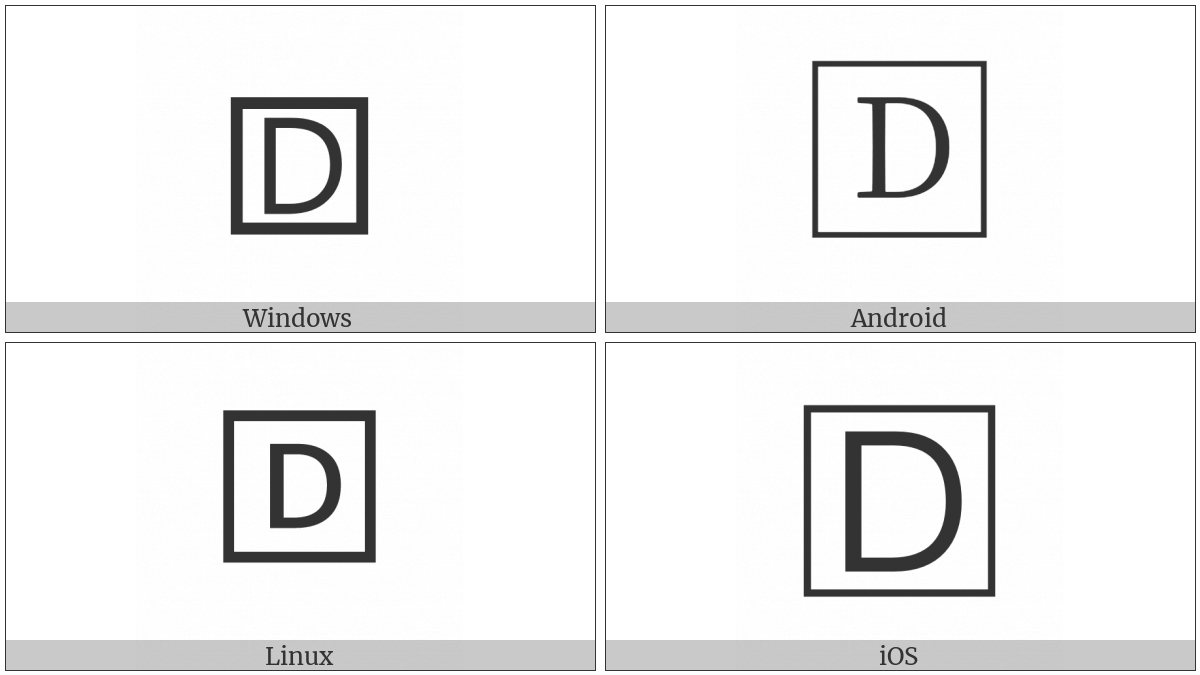 The image below shows how the “Squared Latin Capital Letter D” symbol might look like on different operating systems. If the font in which this web site is displayed does not contain the symbol and there is no fallback font able to render it, you can use the image below to get an idea of what it should look like.