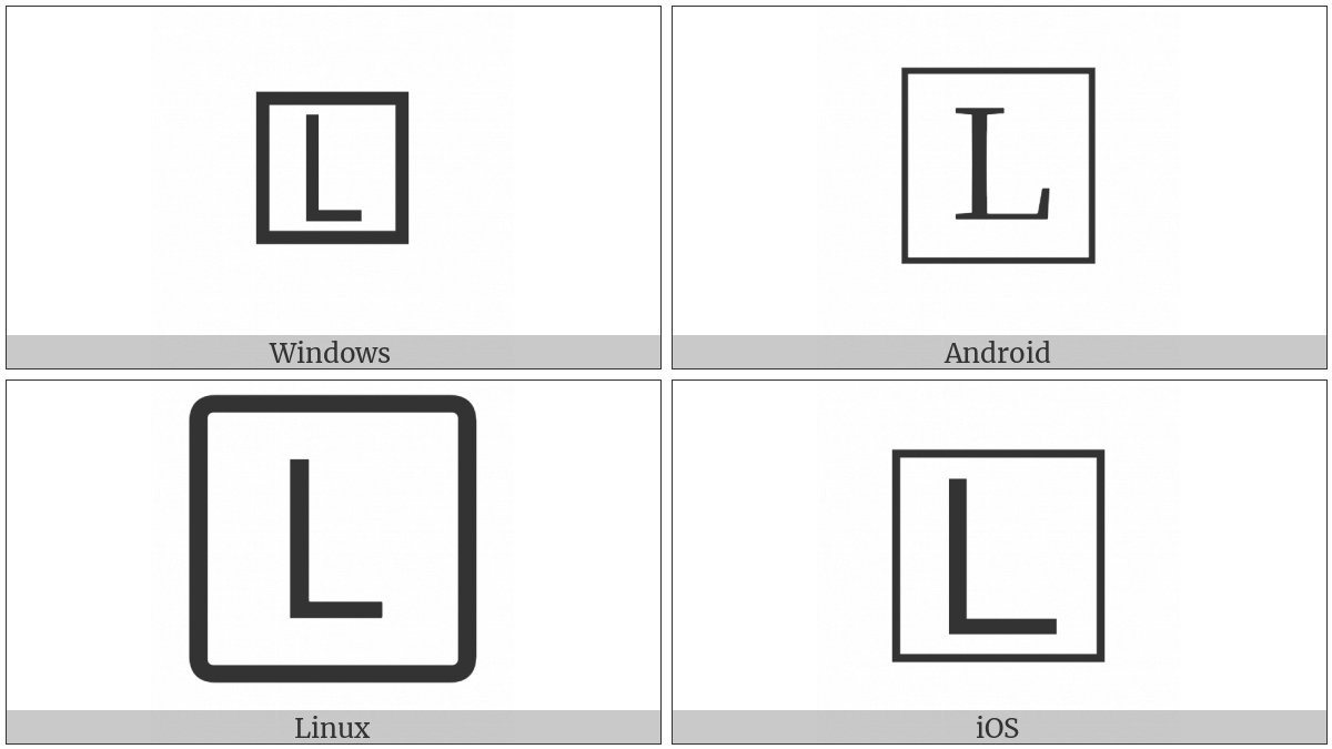 The image below shows how the “Squared Latin Capital Letter L” symbol might look like on different operating systems. If the font in which this web site is displayed does not contain the symbol and there is no fallback font able to render it, you can use the image below to get an idea of what it should look like.